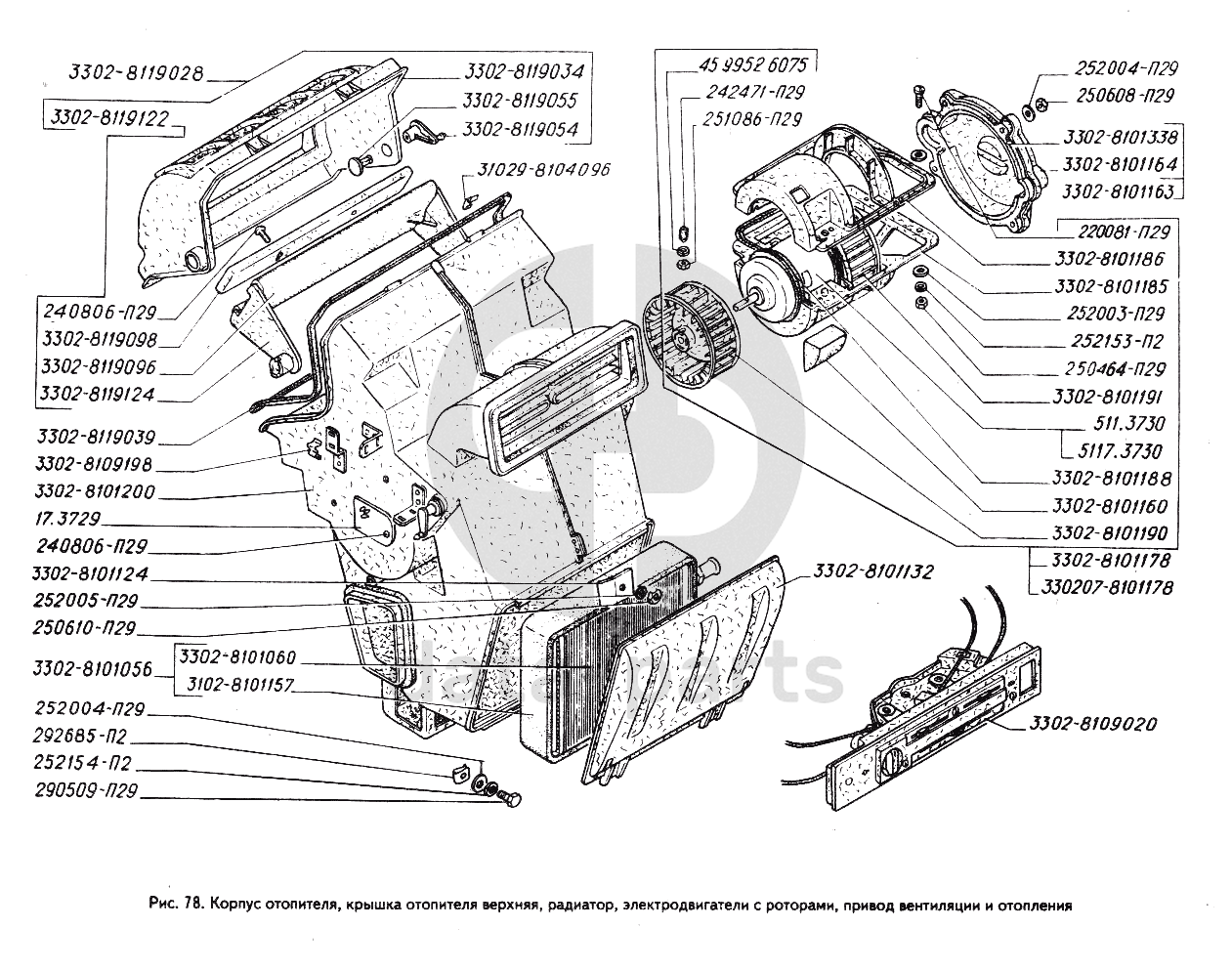 Корпус отопителя, крышка отопителя верхняя, радиатор, электродвигатели с роторами, привод вентиляции и отопления ГАЗ-3302 (ГАЗель)