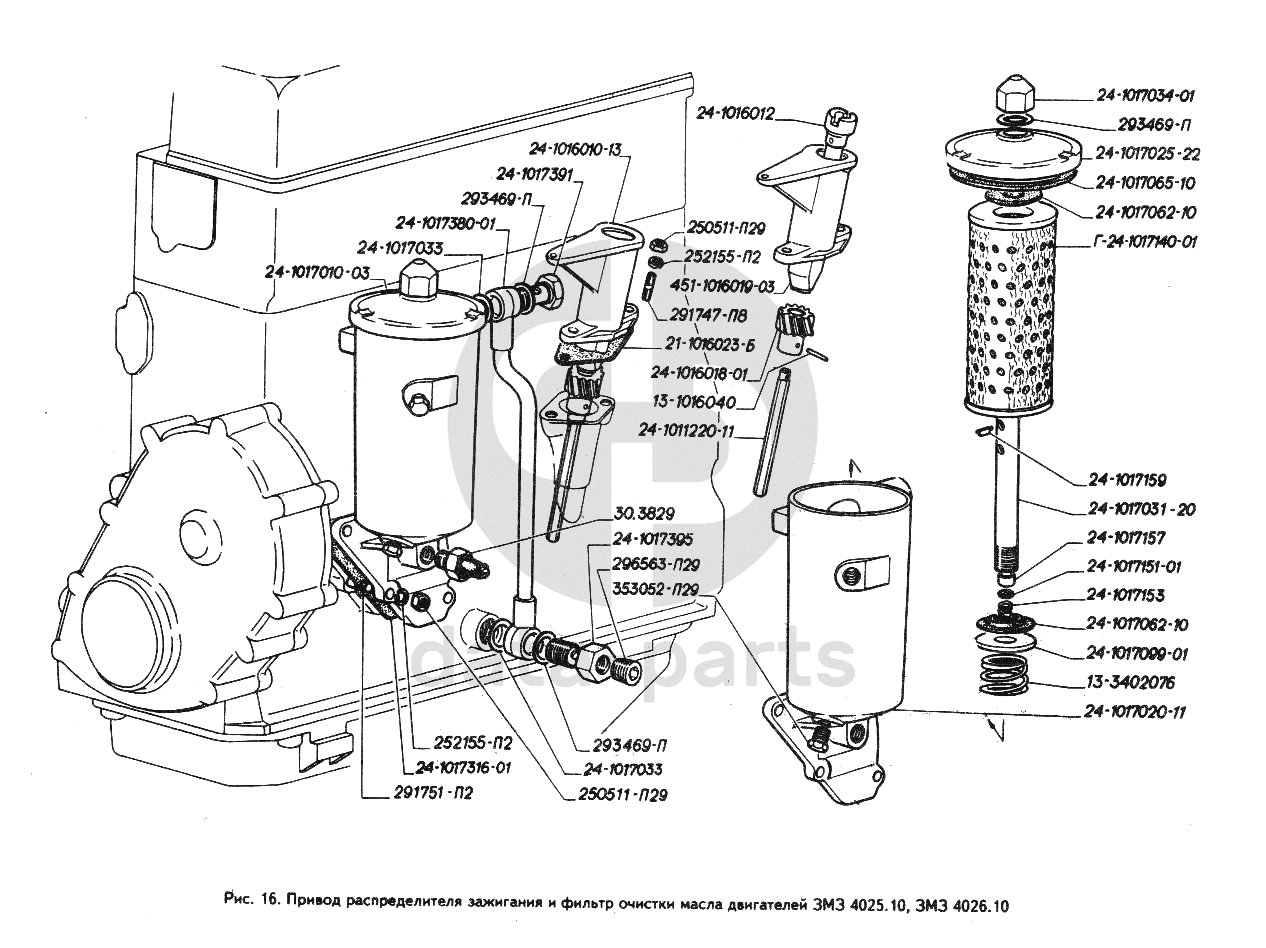 Привод распределителя зажигания и фильтр очистки масла двигателей ЗМЗ 4025.10, ЗМЗ 4026.10 ГАЗ-3302 (ГАЗель)