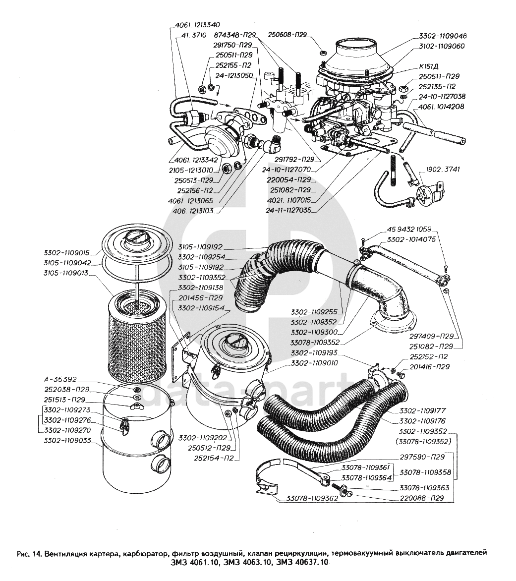 Вентиляция картера, карбюратор, фильтр воздушный, клапан рециркуляции, термовакуумный выключатель двигателей ЗМЗ 4061.10, ЗМЗ 4063.10, ЗМЗ 40637.10 ГАЗ-3302 (ГАЗель)