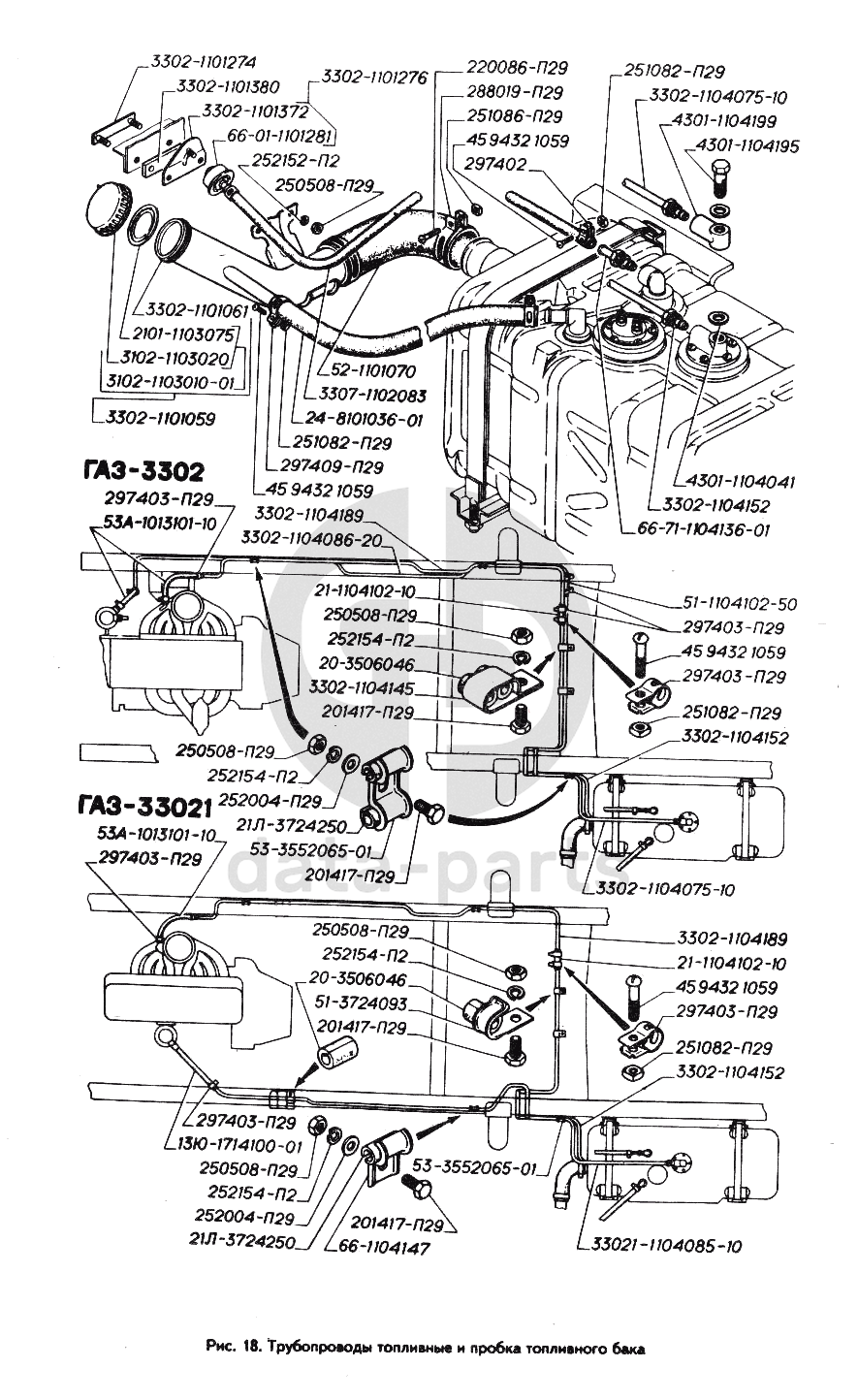 Трубопроводы топливные и пробка топливного бака ГАЗ-3302 (ГАЗель)