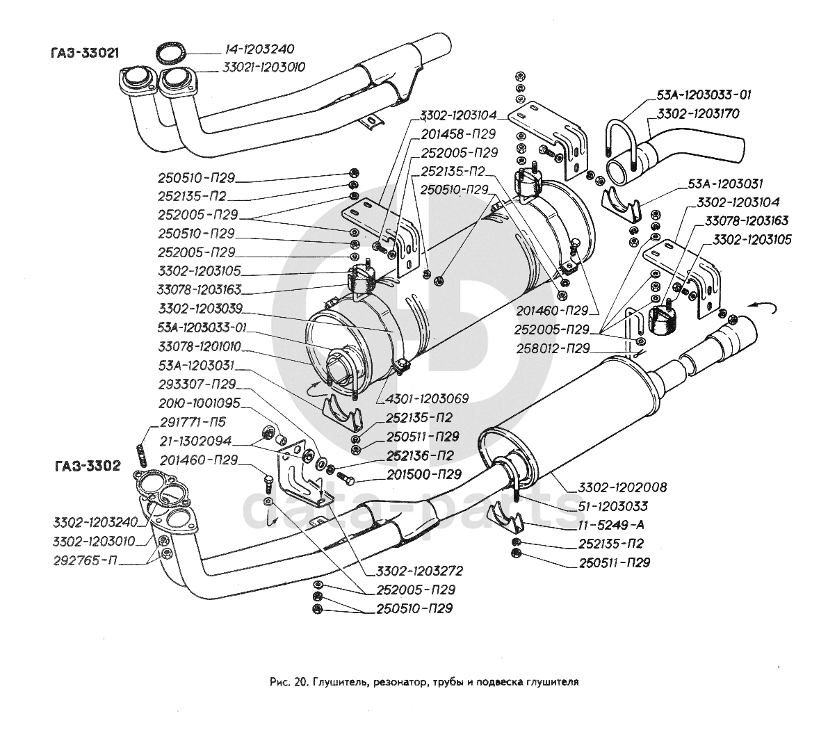 Глушитель, резонатор, трубы и подвеска глушителя ГАЗ-3302 (ГАЗель)