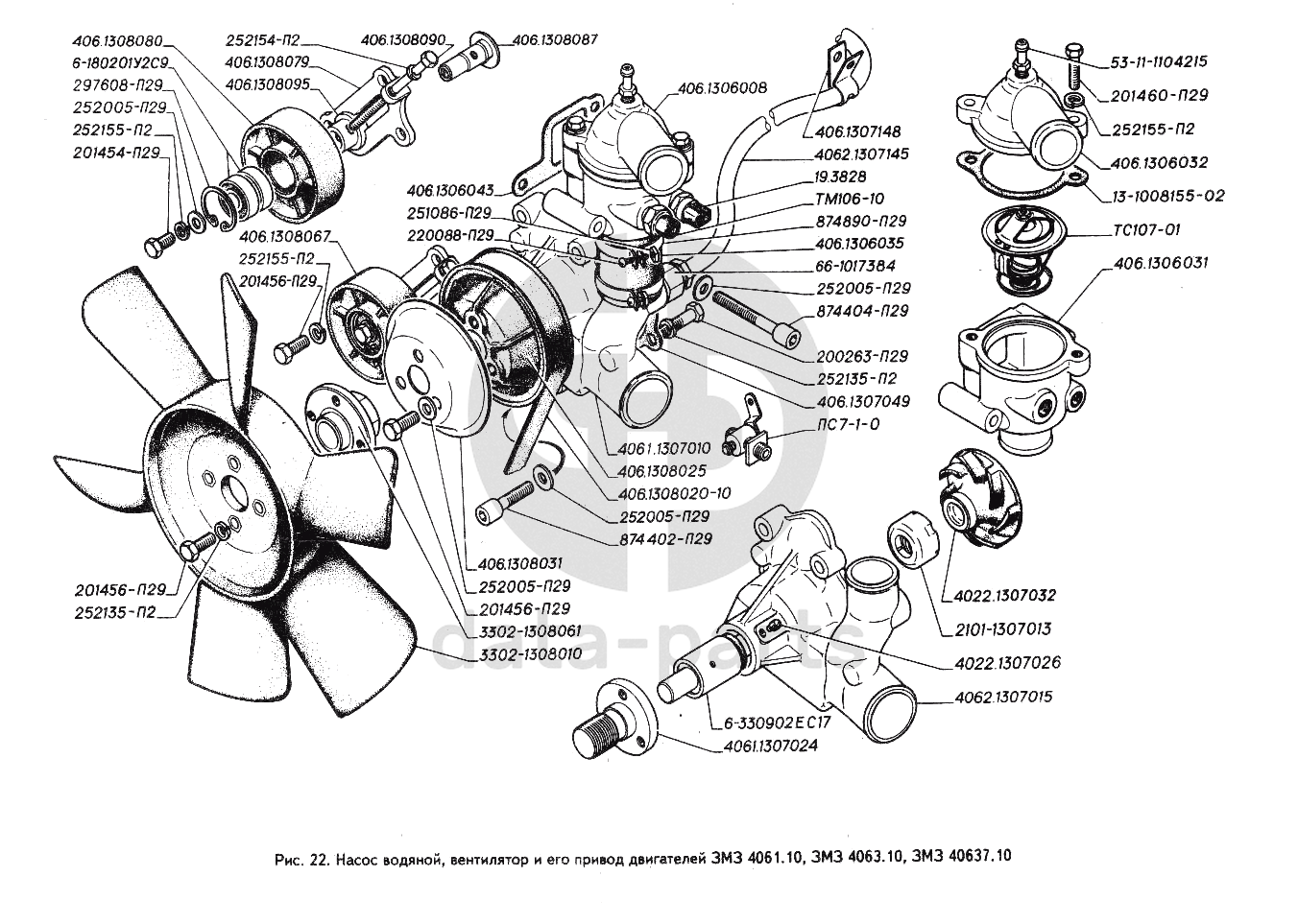 Насос водяной, вентилятор и его привод двигателей ЗМЗ 4061.10, ЗМЗ 4063.10, ЗМЗ 40637.10 ГАЗ-3302 (ГАЗель)