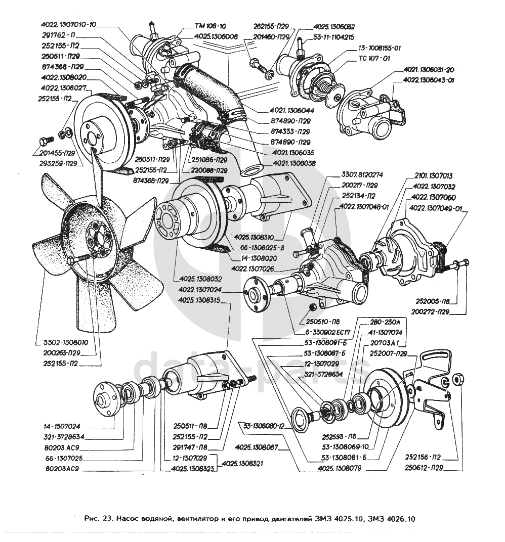 Насос водяной, вентилятор и его привод двигателей ЗМЗ 4025.10. ЗМЗ 4026.10 ГАЗ-3302 (ГАЗель)