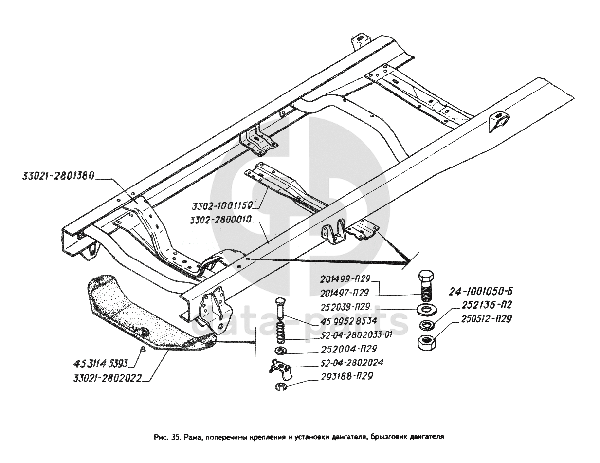 Рама, поперечины крепления и установки двигателя, брызговик двигателя ГАЗ-3302 (ГАЗель)