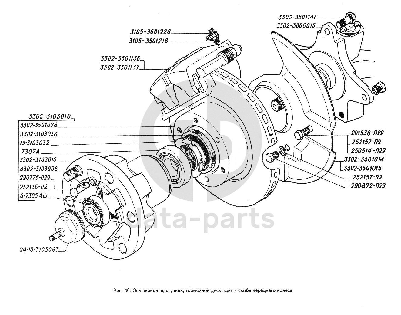 Ступица, тормозной диск, щит и скоба переднего колеса, ось передняя ГАЗ-3302 (ГАЗель)