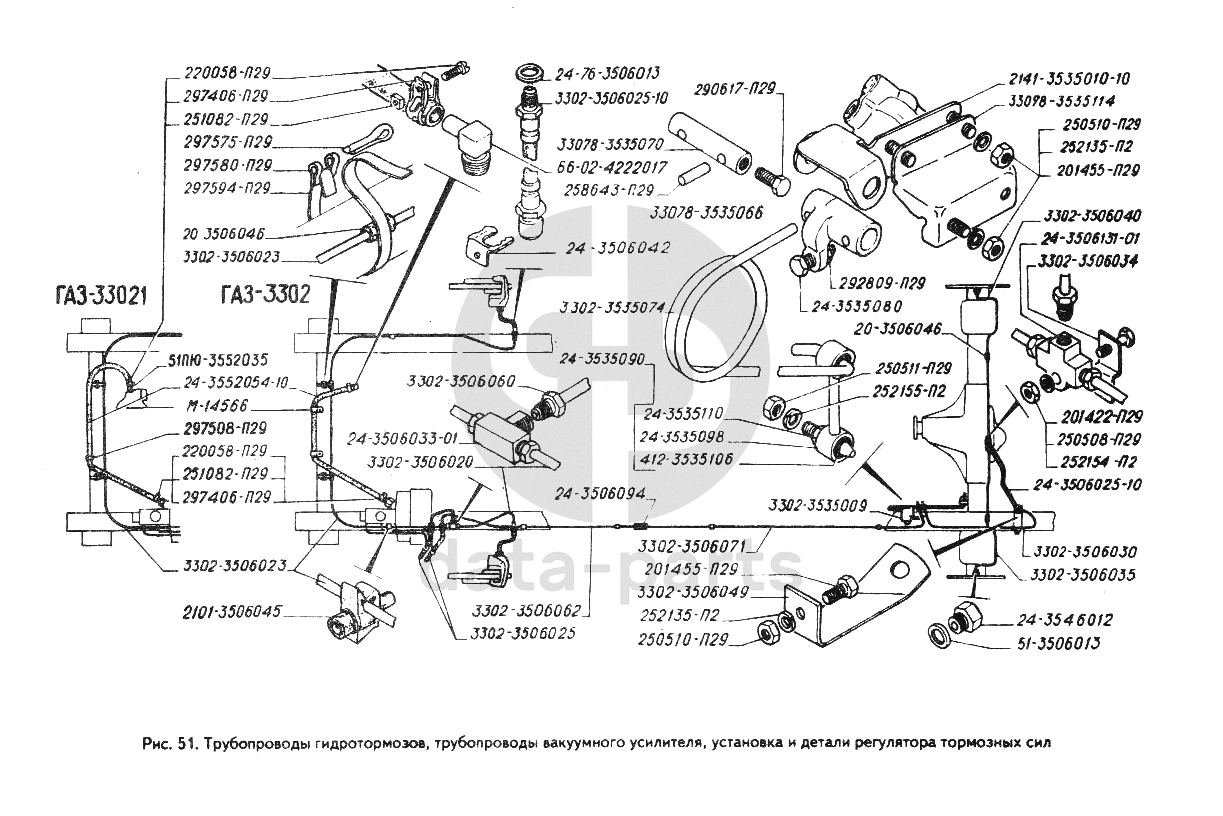 Трубопроводы гидротормозов, трубопроводы вакуумного усилителя, установка и детали регулятора тормозных сил ГАЗ-3302 (ГАЗель)