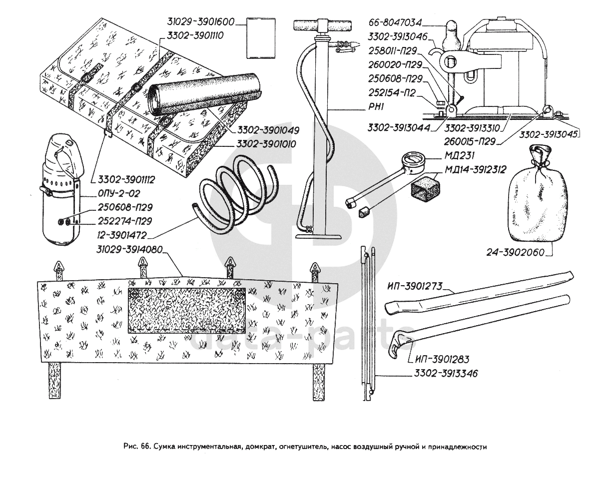 Сумка инструментальная, домкрат, огнетушитель, насос воздушный ручной и принадлежности ГАЗ-3302 (ГАЗель)