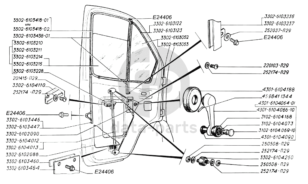 Стекла передних дверей, уплотнители стекол, механизм стеклоподъемника ГАЗ-3302