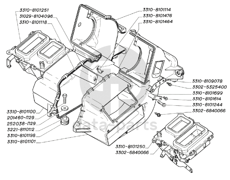 Детали корпуса отопителя (для автомобилей выпуска с 2003 г.) ГАЗ-3302