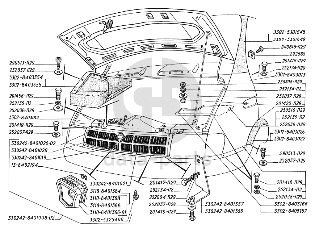 Облицовка радиатора, крылья передние, оперение (для автомобилей выпуска до 2003 г.) ГАЗ-3302
