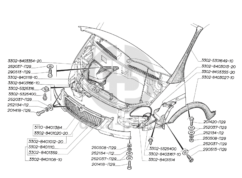 Облицовка радиатора, оперение, крылья (для автомобилей выпуска с 2003 г.) ГАЗ-3302