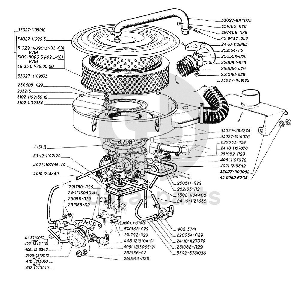 Карбюратор, фильтр воздушный, вентиляция картера двигателей ЗМЗ-406 ГАЗ-3302