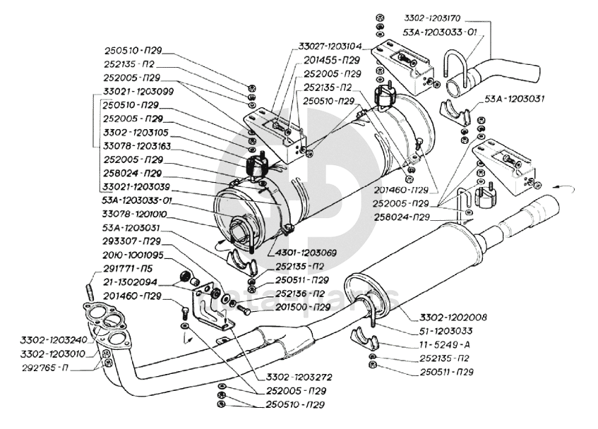 Глушитель, резонатор, трубы и подвеска глушителя двигателей ЗМЗ-406 ГАЗ-3302
