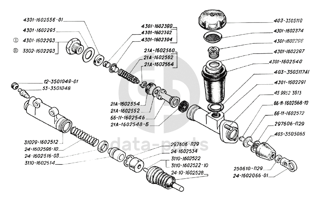 Детали главного и рабочего цилиндров привода выключения сцепления ГАЗ-3302