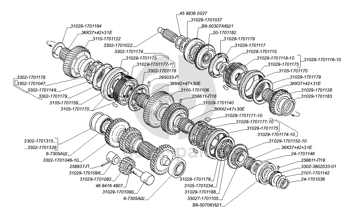 Валы и шестерни коробки передач (для автомобилей выпуска с 2004 г.) ГАЗ-3302