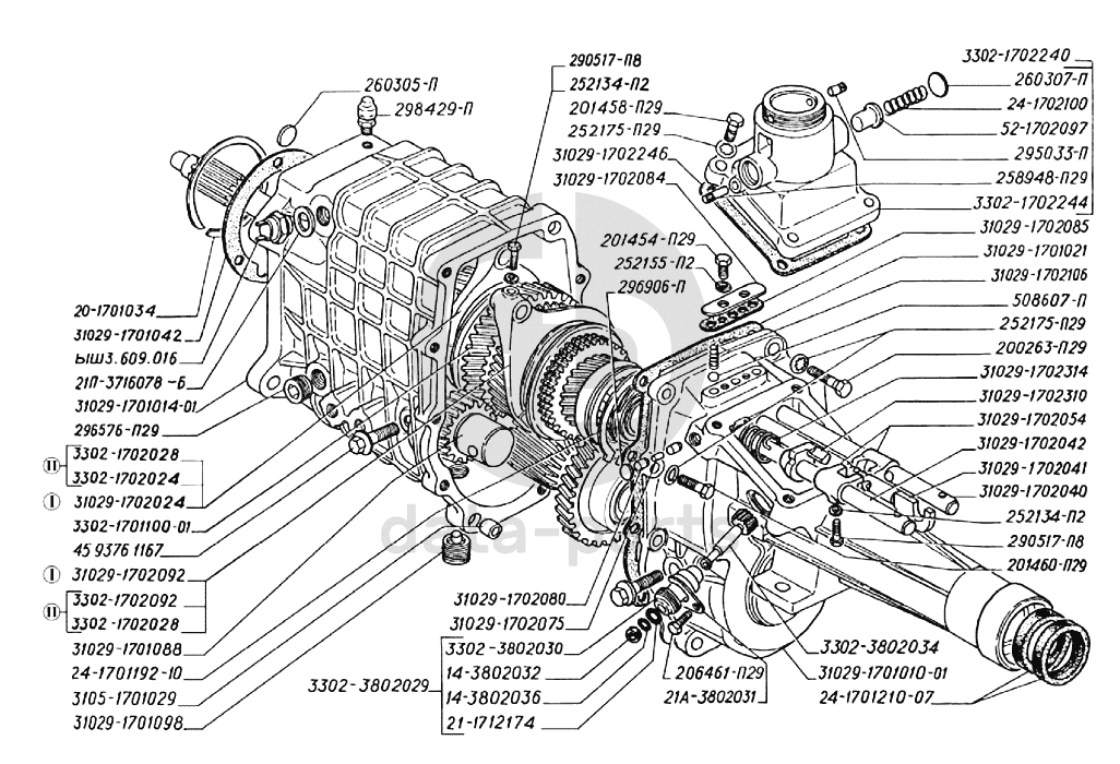 Картеры передний и задний, валы в сборе, механизм переключения коробки передач ГАЗ-3302