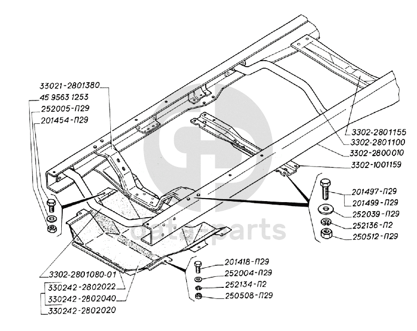 Рама, поперечины крепления двигателя, брызговик двигателя ГАЗ-3302