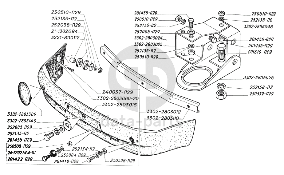 Буфер передний, переднее буксирное устройство (для автомобилей выпуска до 2003 г.) ГАЗ-3302