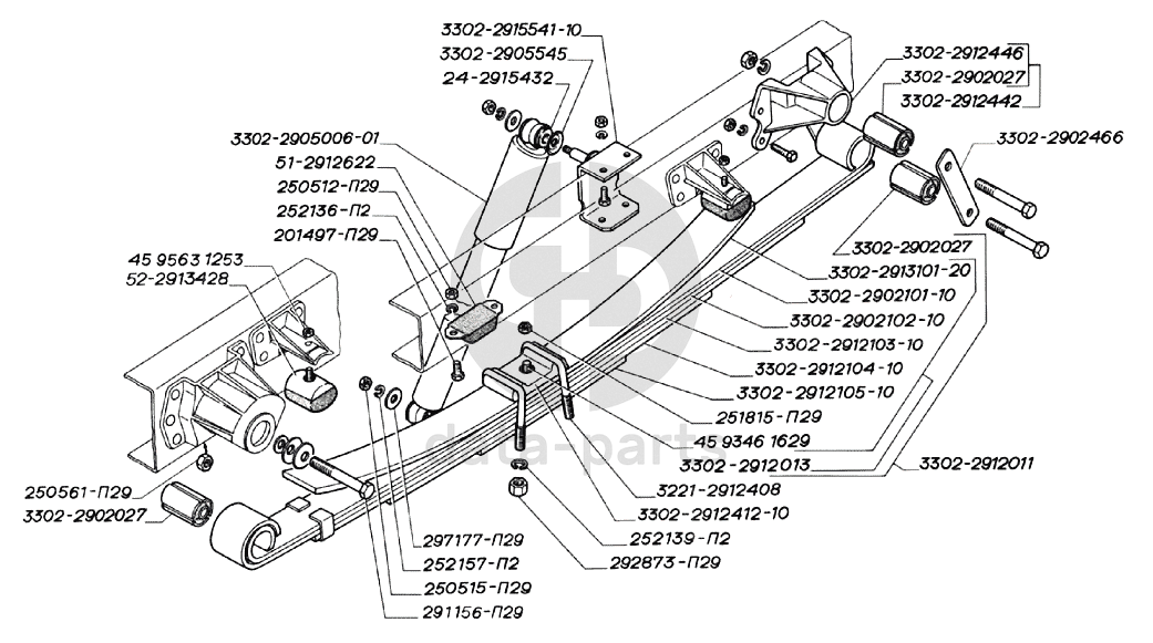Установка задней подвески. Рессора задняя многолистовая (для автомобилей выпуска до января 2003 г.) ГАЗ-3302