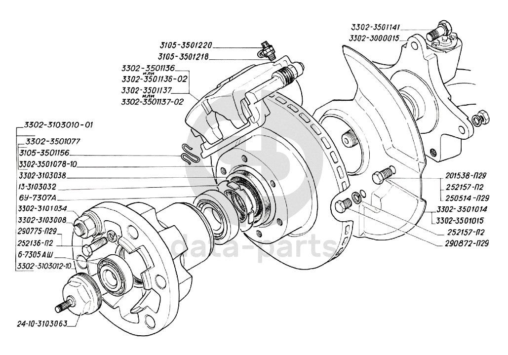 Ось передняя, ступица переднего колеса, тормозной диск, щит и скоба дискового тормоза ГАЗ-3302