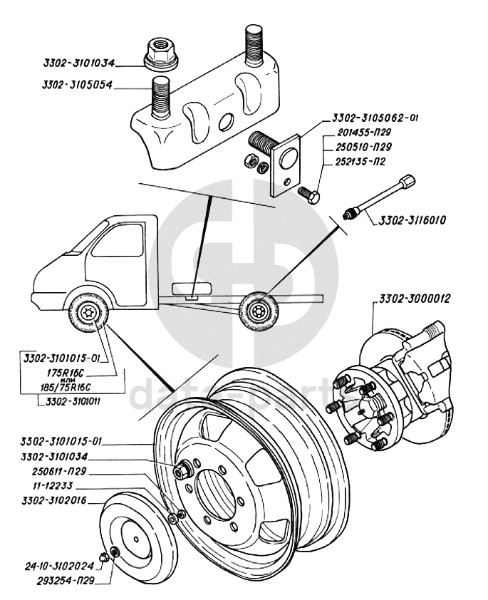 Колеса, колпаки колес, шины, ось передняя с тормозами ГАЗ-3302