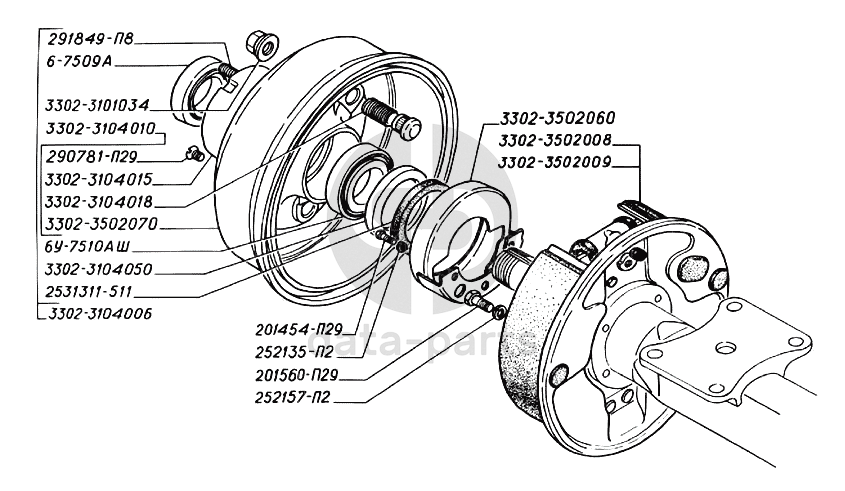 Ступица заднего колеса с барабаном, тормоз колодочный задний ГАЗ-3302