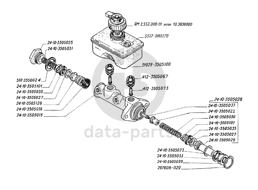 Детали главного цилиндра тормозов, бачок главного цилиндра, датчик аварийного уровня тормозной жидкости ГАЗ-3302