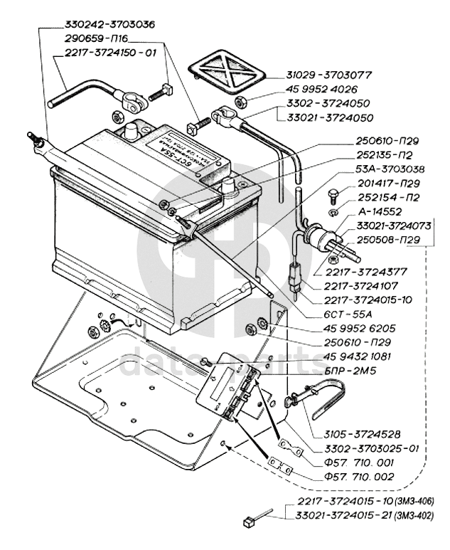 Батарея аккумуляторная, крепление батареи и проводов, блок предохранителей ГАЗ-3302