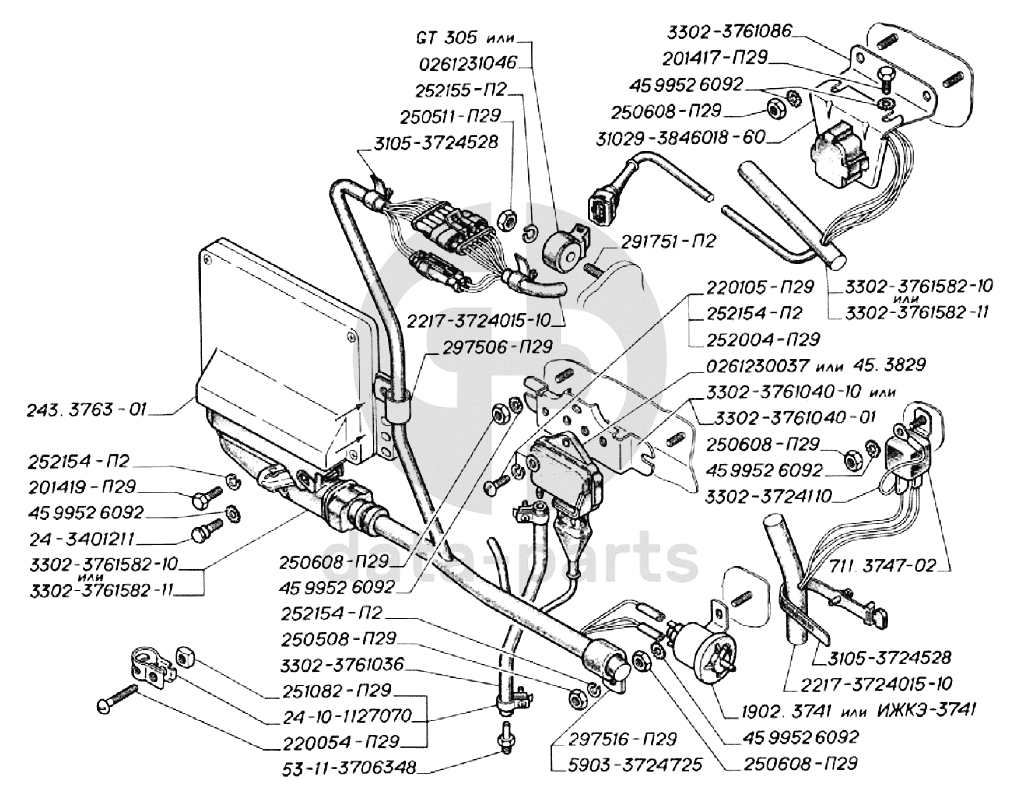 Блок управления, электромагнитный клапан ЭПХХ, датчики двигателей ЗМЗ-406, реле стартера ГАЗ-3302
