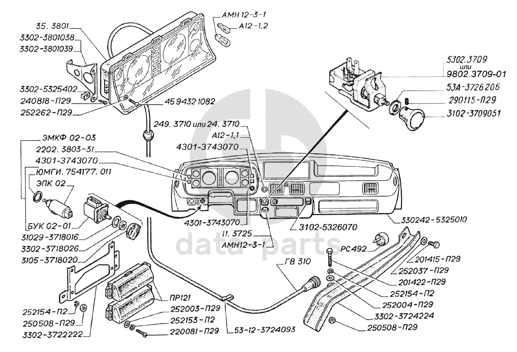 Панель с приборами, комбинация приборов, блоки предохранителей (для автомобилей выпуска до 2003 г.) ГАЗ-3302