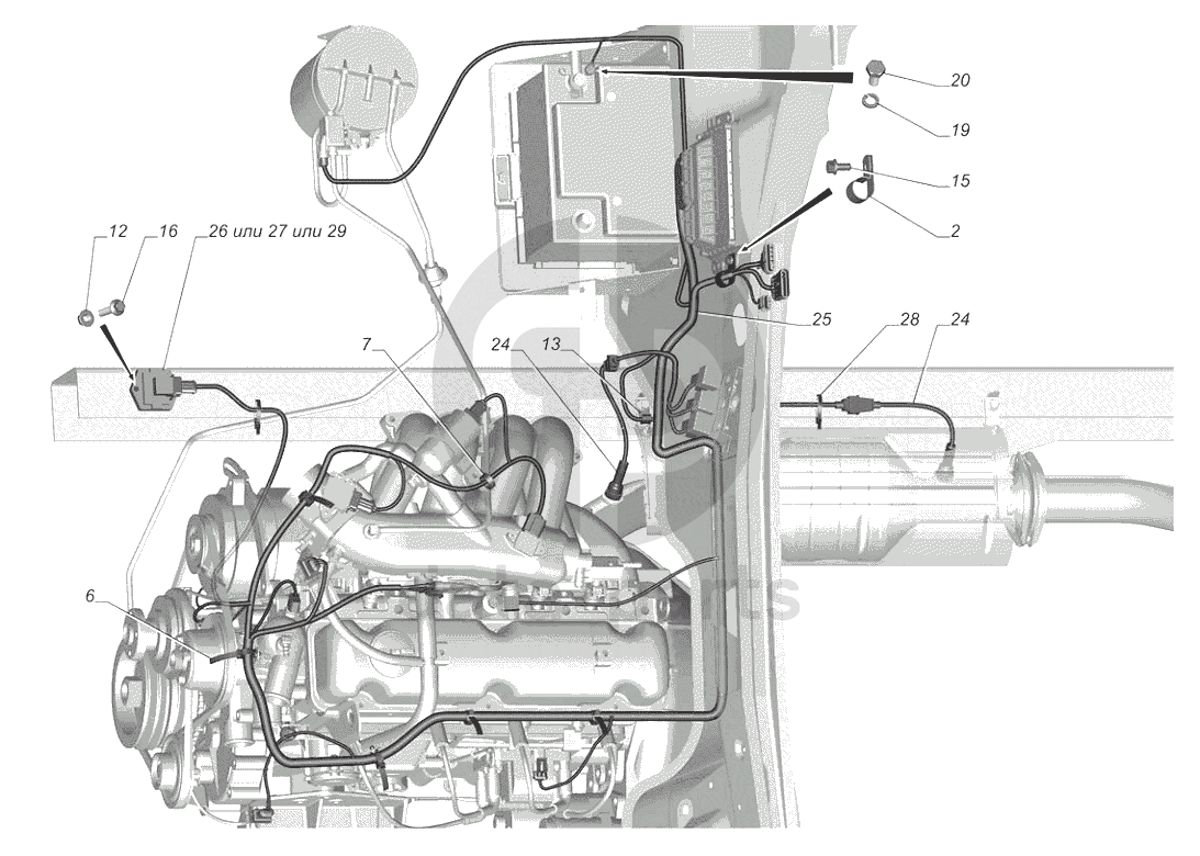 2705-3761001. Установка приборов системы управления двигателем и жгута проводов ГАЗ-3302 (с двиг. УМЗ)