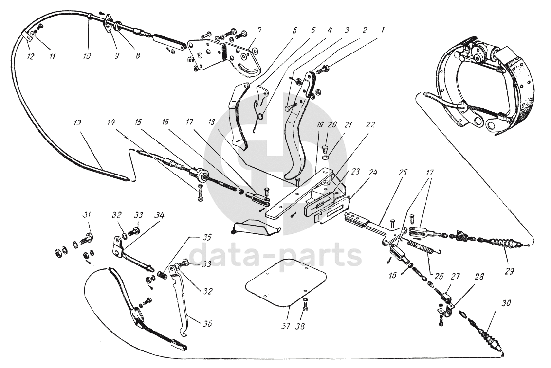 Сектор ручного рычага с кронштейном крепления оболочки переднего стального каната тормоза в сборе