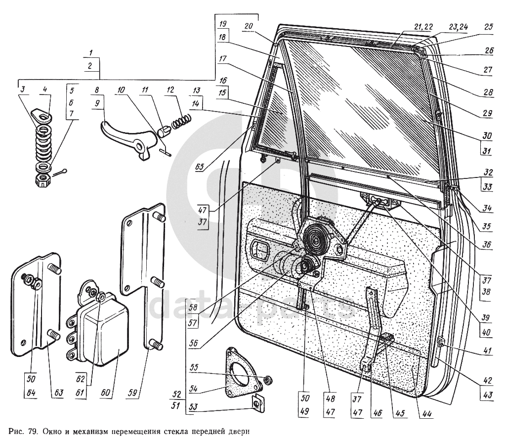 Окно и механизм перемещения стекла передней двери ГАЗ-14 (Чайка)