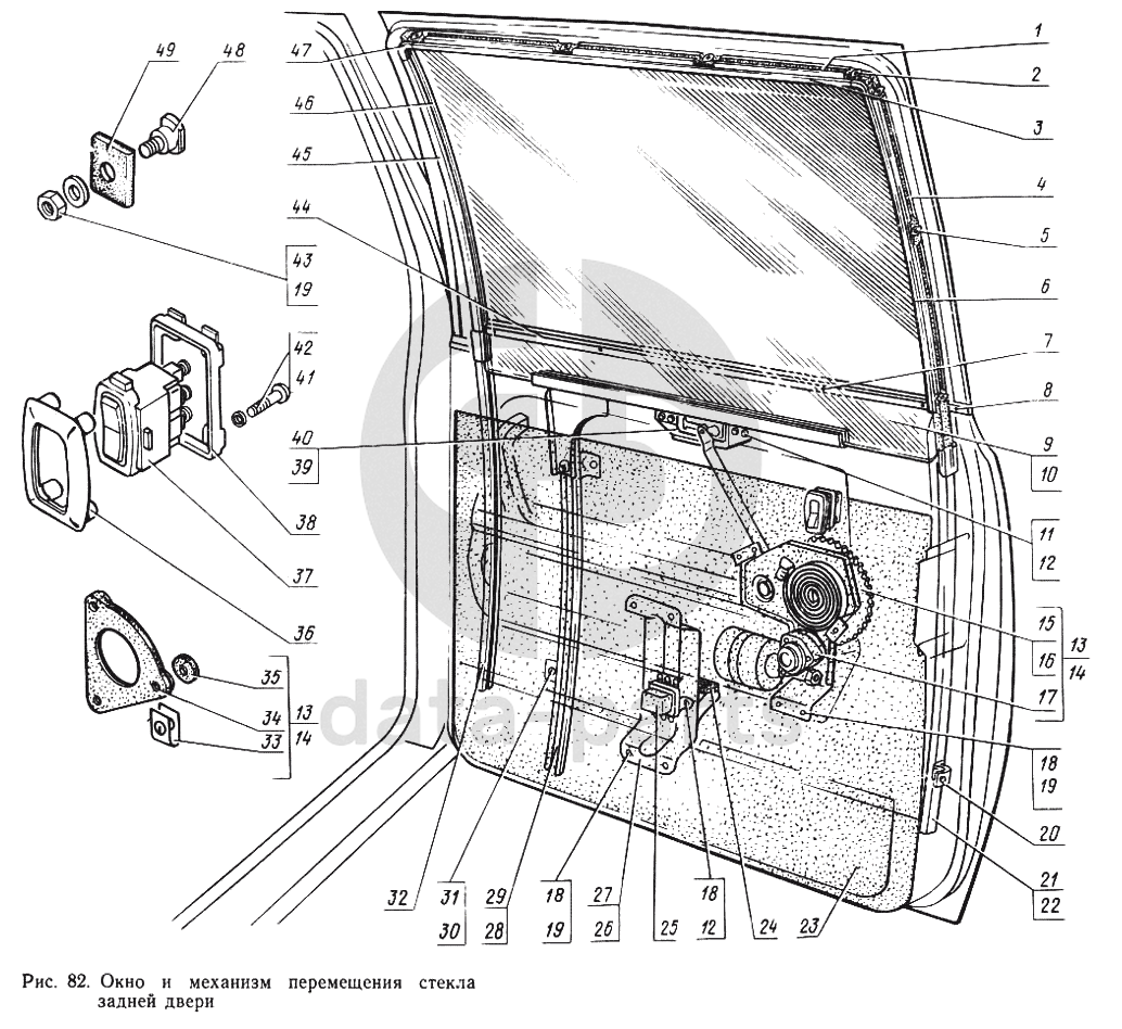 Окно и механизм перемещения стекла задней двери ГАЗ-14 (Чайка)