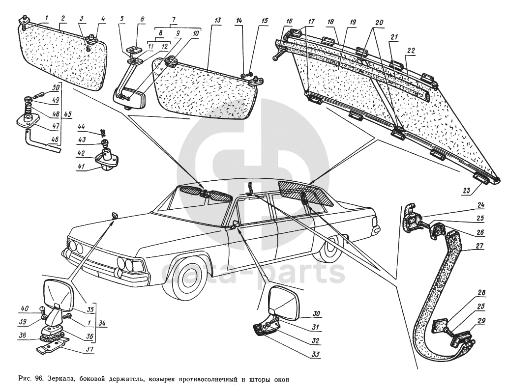 Зеркала, боковой держатель, козырек противосолнечный и шторы окон ГАЗ-14 (Чайка)