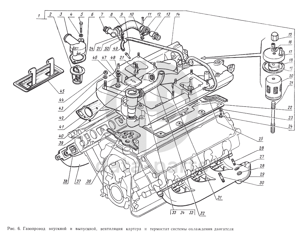 Газопровод впускной и выпускной, вентиляция картера и термостат системы охлаждения двигателя ГАЗ-14 (Чайка)