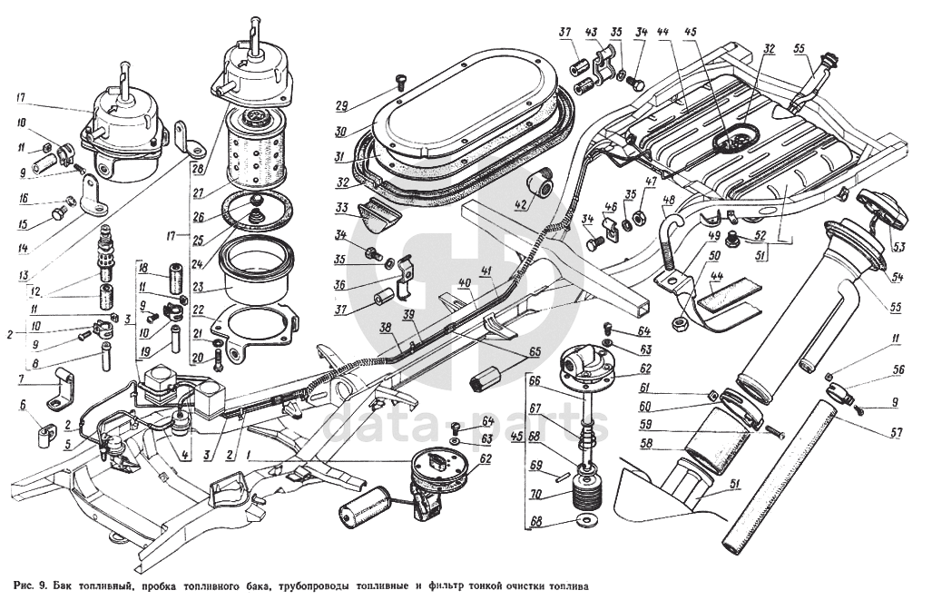 Бак топливный, пробка топливного бака, трубопроводы топливные и фильтр тонкой очистки топлива ГАЗ-14 (Чайка)