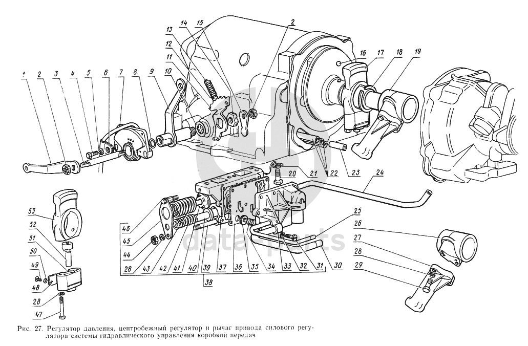 Регулятор давления, центробежный регулятор и рычаг привода силового регулятора системы гидравлического управления коробкой передач ГАЗ-14 (Чайка)