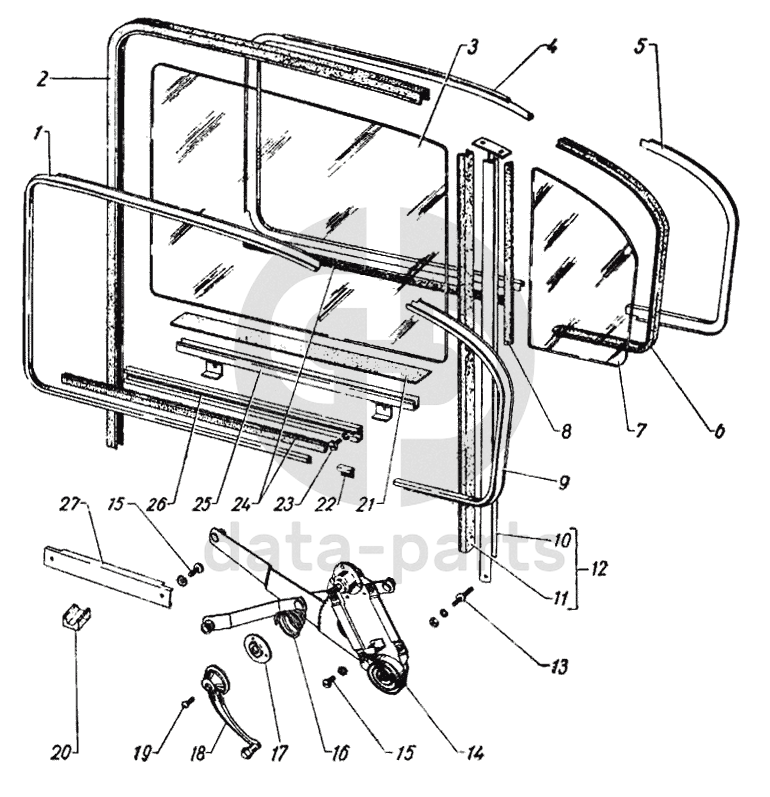Окно задней двери и механизм перемещения стекол ГАЗ-21