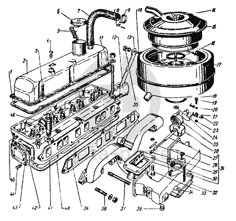 Головка блока, газопровод и воздушный фильтр ГАЗ-21