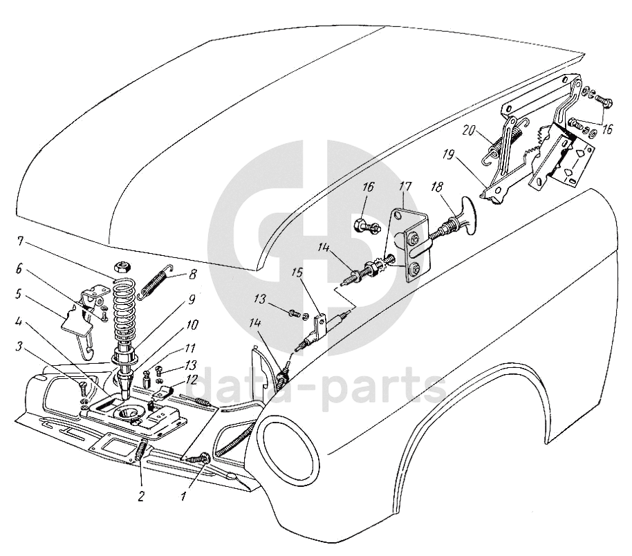 Замок и привод замка капота ГАЗ-21