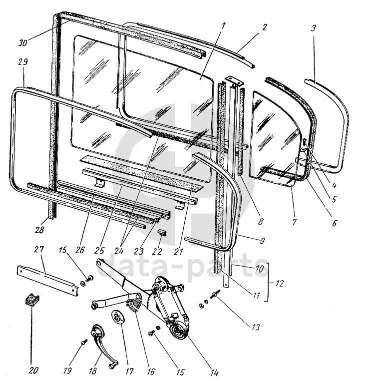Окно задней двери и механизм перемещения стекол ГАЗ-21