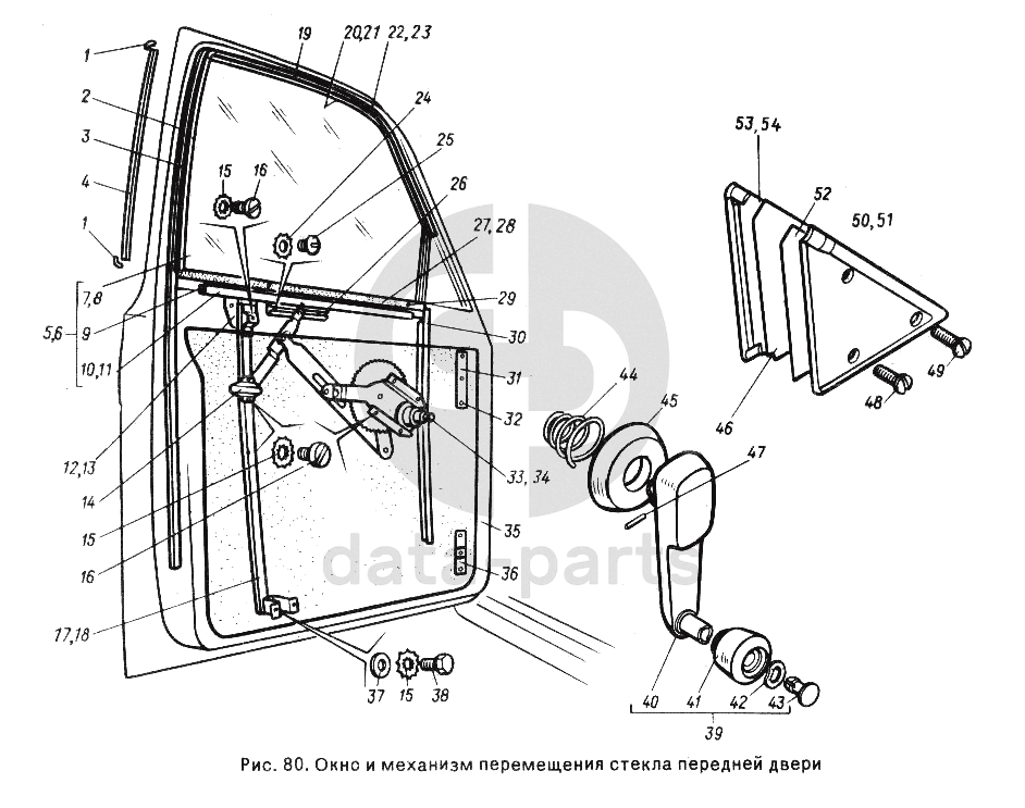 Окно и механизм перемещения стекла передней двери ГАЗ-24-10