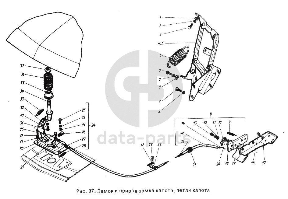 Замок и привод замка капота, петли капота ГАЗ-24-10