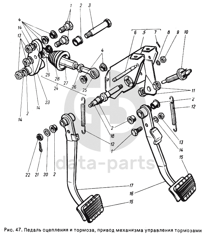 Педаль сцепления и тормоза, привод механизма управления тормозами ГАЗ-24-10