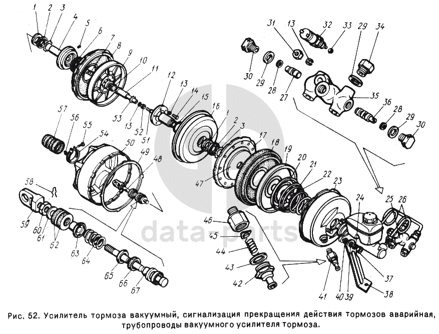 Усилитель тормоза вакуумный, сигнализация прекращения действия тормозов аварийная, трубопроводы вакуумного усилителя тормоза ГАЗ-24-10