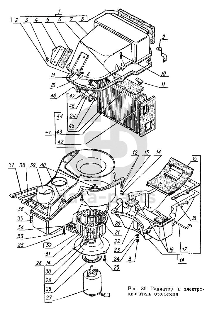 Радиатор и электродвигатель отопителя ГАЗ-3102