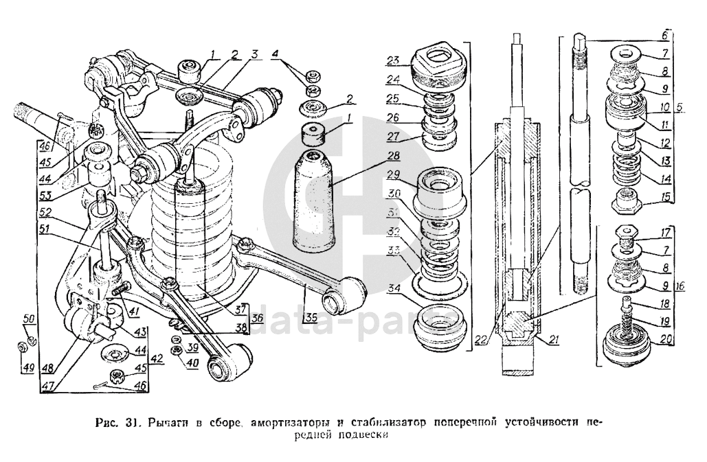 Рычаги в сборе, амортизаторы и стабилизатор поперечной устойчивости передней подвески ГАЗ-3102