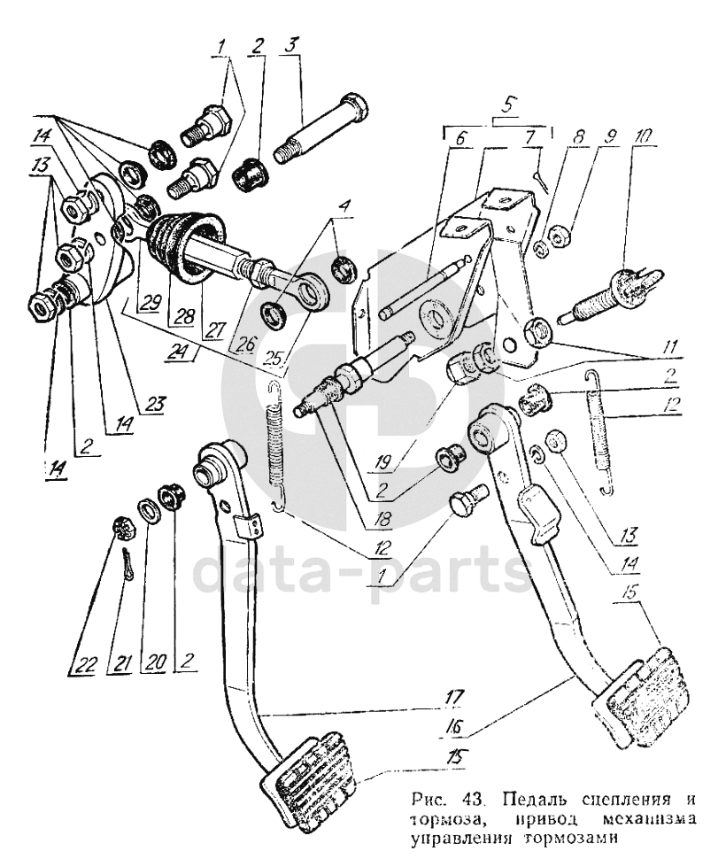 Педаль сцепления и тормоза, привод механизма управления тормозами ГАЗ-3102