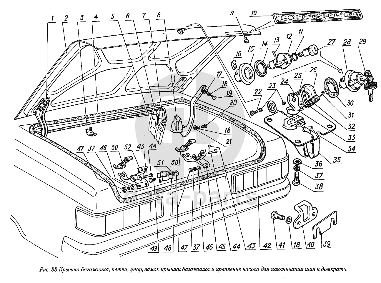 Крышка багажника, петли, упор, замок крышки багажника и крепление насоса для накачивания шин и домкрата ГАЗ-31029